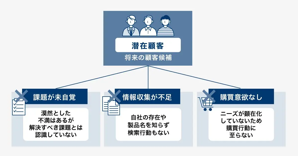 | 潜在顧客 | 課題を自覚していない(ニーズ未顕在) | 購買行動なし・情報収集もしていない | 課題を認識させニーズを引き出す働きかけ |