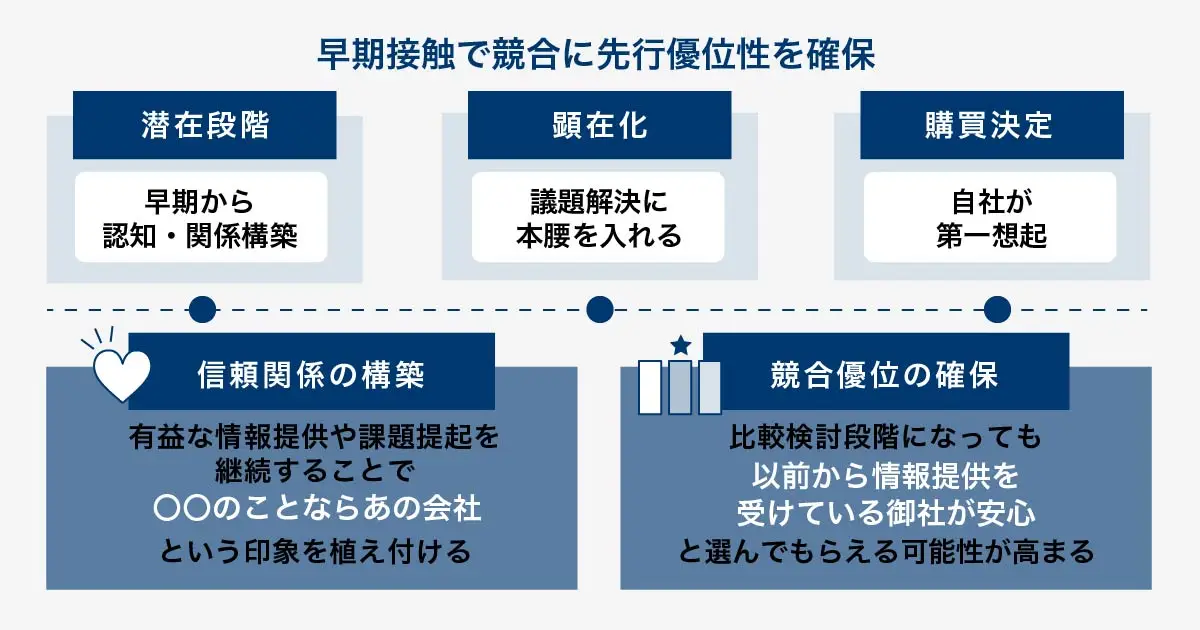 | 先行優位性の確保 | 競合他社より先に関係を築くことで、ニーズ顕在化時に第一想起される |