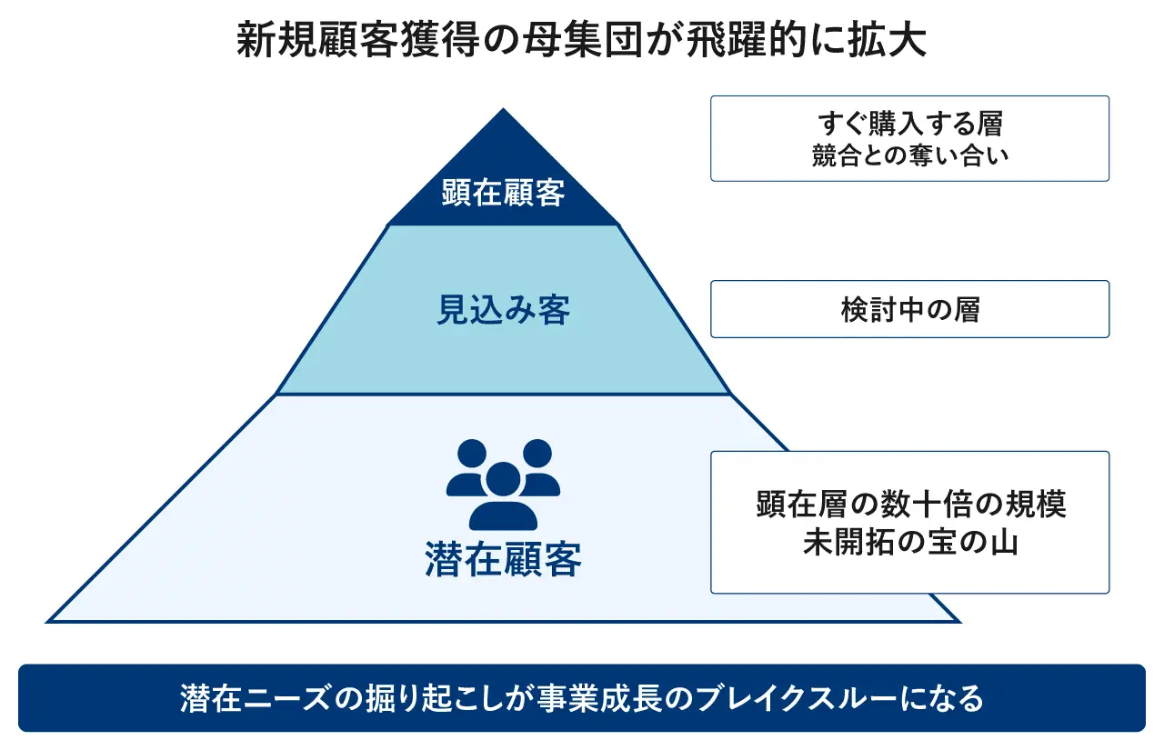 一般に「潜在顧客のボリュームは顕在顧客の数十倍」ともいわれます。この広大な裾野にアプローチできれば、新規顧客獲得の機会は飛躍的に増加します。