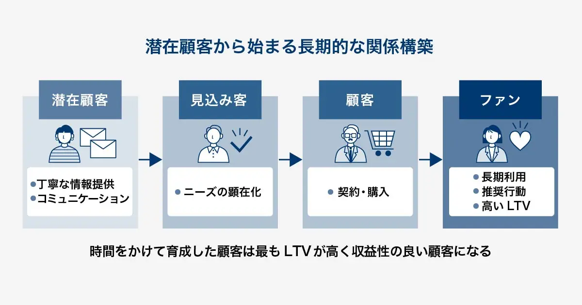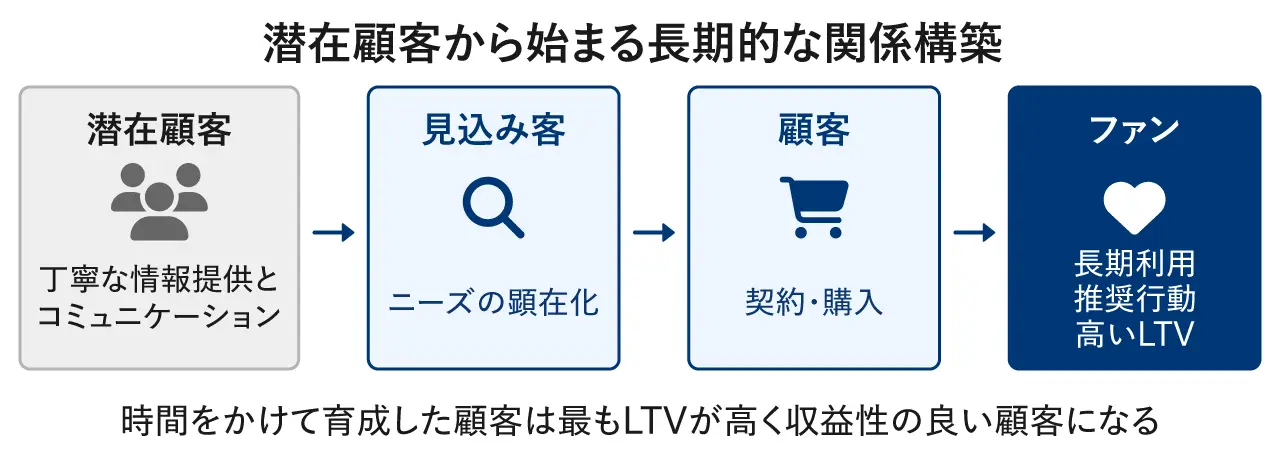 長期的視野で見れば、潜在顧客時代から関係を育んだ顧客こそが、最もLTV(顧客生涯価値)が高く収益性の良い顧客になり得ます。