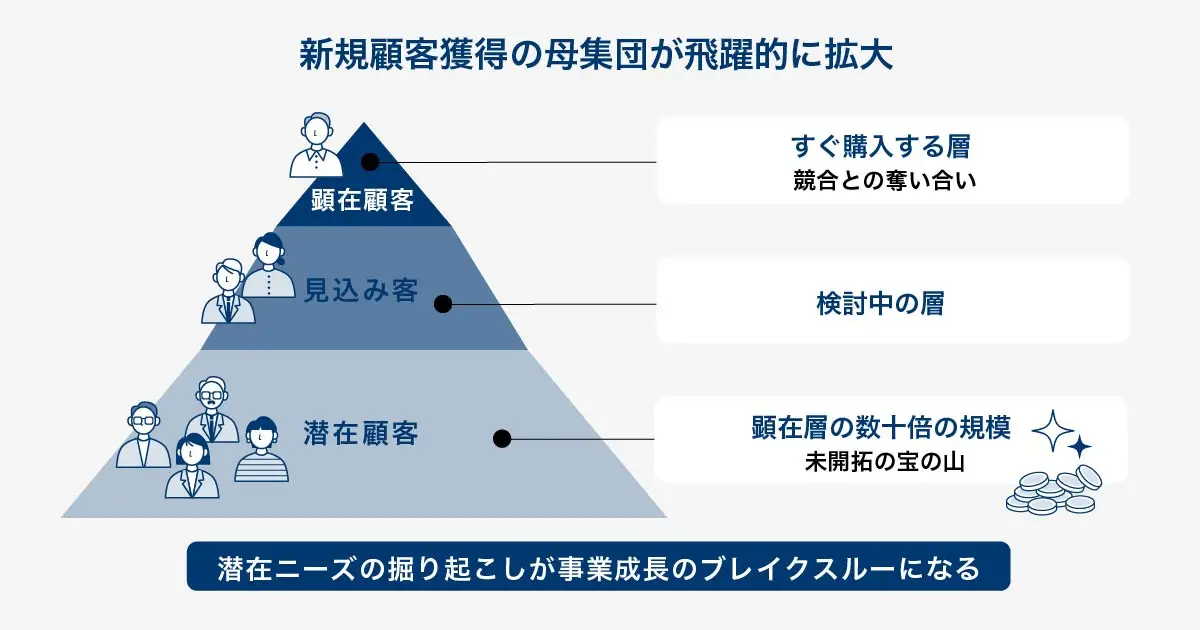 潜在顧客を掘り起こす最大のメリットは、新規顧客獲得の母集団が飛躍的に拡大することです。
