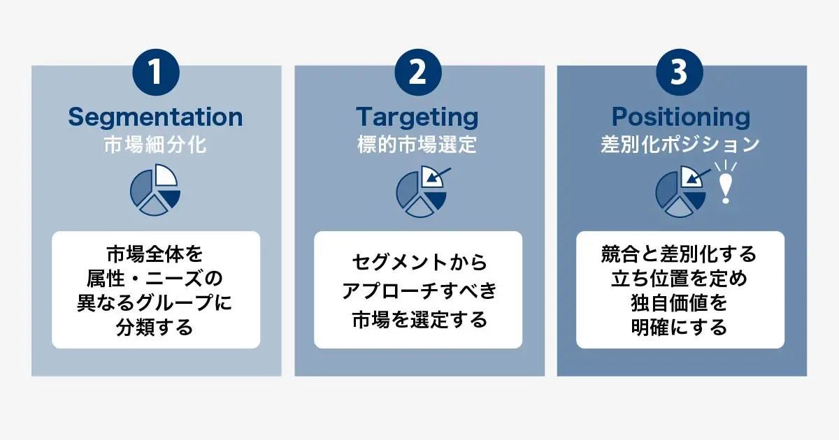 【STP分析の実践手順】 ・Segmentation(セグメンテーション):市場全体を属性やニーズの異なるいくつかのグループに分類します。たとえばBtoCなら年齢層やライフスタイル、BtoBなら業種や企業規模など、顧客を分ける変数を洗い出して細分化します。 ・Targeting(ターゲティング):細分化されたセグメントの中から、自社がアプローチすべき市場を選定します。各セグメントの規模や成長性、自社との親和性などを評価して、潜在顧客になり得る層が十分存在し、なおかつ自社が攻略しやすい魅力的な市場を絞り込みます。 ・Positioning(ポジショニング):選んだターゲット市場で、自社商品・サービスを競合と差別化する立ち位置を定めます。ターゲット顧客に対し、自社がどのような独自価値を提供できるかを明確にする戦略です。 |