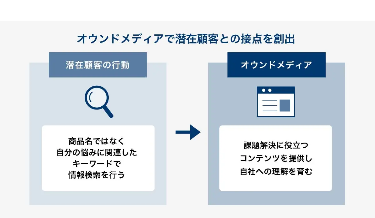 潜在顧客は商品名ではなく、自分の抱える悩みに関連したキーワードで情報検索を行うため、彼らの課題解決に役立つコンテンツを提供すれば、関心を引きつつ自社への理解を育めます。